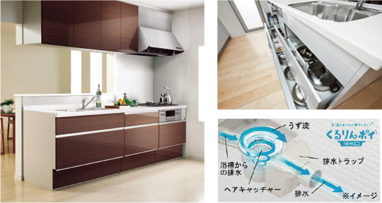 オール引き出しの採用で、抜群の収納量と共に、奥の物の取り出しやすさを向上。静かにゆっくり閉まるファインモーションも搭載しています。お掃除しやすい扉は15柄から選べ、人造大理石天板ももちろん標準です。