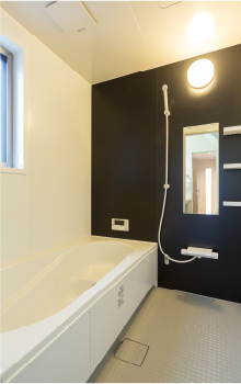 LIXILのベストセラーシステムバス、「Arise」を採用。人気のアクセントウォールデザインは、意匠性と清掃性を両立します。
